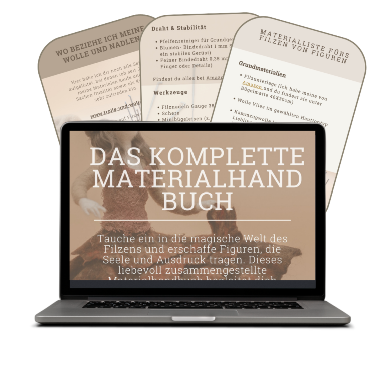 Mit meiner sorgfältig zusammengestellten Materialliste bekommst du eine klare, einfache Übersichtüber all die Werkzeuge, Wollsorten und Zusatzmaterialien, die ich selbst täglich benutze – erprobt, hochwertig und ideal für Anfänger wie auch Fortgeschrittene.